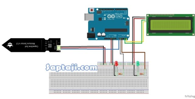 Dari alat dan bahan di atas, kemudian buatlah rangkaian seperti pada gambar di bawah ini. Kali ini kita akan membuat sistem sederhana menyalakan LED berdasarkan kondisi kelembaban tanah. Untuk nilai kelembaban tanah sendiri juga akan ditampilkan dalam LCD 1602