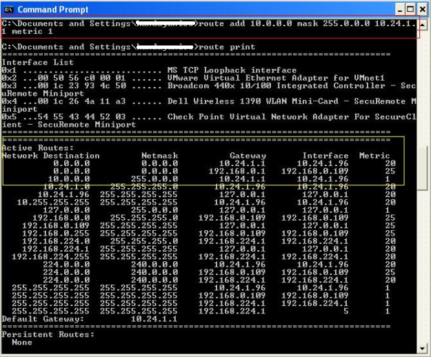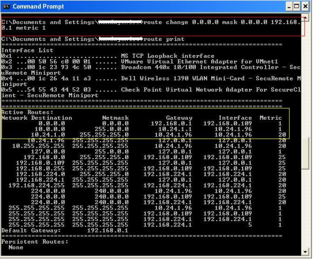 3. Kemudian ketik ‘route print‘ dan perhatikan ‘default gateway’ masih di 10.24.1.1 (server di intranet). Agar laptop bisa terhubung internet dan intranet secara bersamaan, Anda harus mengatur routing data agar koneksi internet menjadi ‘first priority connection’ dan koneksi intranet sebagai ‘second priority’. Caranya adalah sebagai berikut :