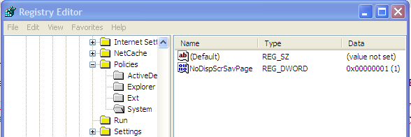 2. Masuklah ke HKEY_CURRENT_USER\Software\Microsoft\Windows\CurrentVersion\Policies\System. Disebelah kanan terdapat nilai DWORD yang bernama “NoDispScrSavPage”. Jika datanya bernilai 1, ini artinya tab scrensaver Anda di-disable. Oleh karena itu ubahlah nilai tersebut menjadi 0 (nol) agar tab screensaver muncul kembali (enable)
