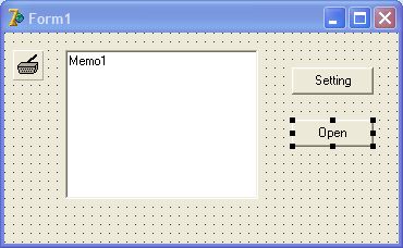 Kemudian tambahkan komponen Button dua buah dan atur komposisinya sesuai gambar di atas. Double click tombol ‘Setting’ dan masukkan kode program di bawah