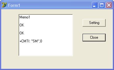 Sekarang kita running program di atas, dan lihat hasilnya. Pasang modem Anda, dan klik tombol ‘Setting’, dan pilih COM port dimana modem berada. Setelah Anda klik tombol ‘Open’, maka komunikasi dengan modem sudah berjalan, dan setiap data yang masuk akan terbaca di kotak Memo.