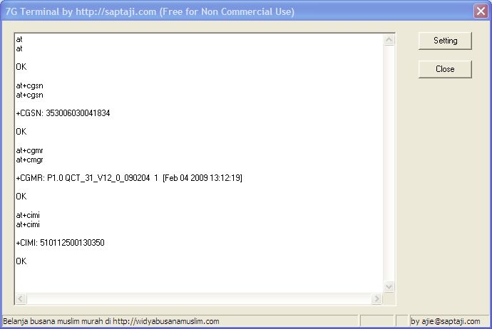 Tanpa basa-basi, silahkan download ‘7G Terminal’ di sini. Software ini sifatnya portable, jadi tidak perlu menginstal, cukup double click saja software ini. Pun, jika ingin memindahkan software ini, cukup di-copy and paste di tempat baru. Cara menggunakan software ini juga sangat mudah, yakni tinggal melakukan setting parameter komunikasi serial (klik tombol ‘Setting’) dan klik tombol ‘Open’) untuk melakukan koneksi dengan device yang terhubung melalui serial port (COM) baik koneksi fisik maupun virtual. Setelah itu Anda cukup ketikkan perintah-perintah yang ingin Anda kirim melalui serial port dan tekan tombol enter, bila ada balasan dari device yang terhubung, maka data yang dikirim device tersebut akan langsung tertampil. Jika Anda sudah pernah menggunakan hyper terminal, Anda tidak akan kesulitan menggunakan software ini.