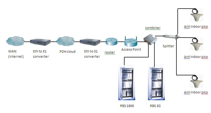 Combiner ini kita pasang di paling ujung sebelum masuk ke sistem feeder-antenna GSM, dengan satu input dari frekuensi GSM (1800/2100 MHz) dan input lainnya dari Access Point (pemancar) WIFI dengan frekuensi 2400 MHz. Berikut ini gambar topologi/konfigurasi jaringan WIFI over Picocell yang berhasil penulis implementasikan.