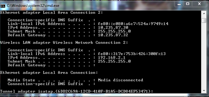 Begitu status koneksi menjadi ‘Connected’ berarti laptop saya sekarang sudah terhubung dengan jaringan mini hotspot dengan nama ‘7G-Winpad-Spot’. Untuk membuktikannya, coba kita lihat IP address laptop saya ini. Dari Start Menu pilih ‘run’ dan ketik ‘cmd’. Begitu window command prompt muncul ketik ‘ipconfig’, dan akan muncul IP yang di-assign ke laptop