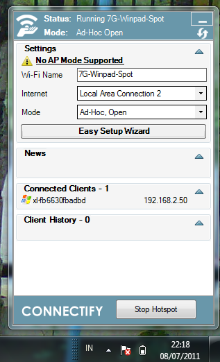 Sekarang Anda sudah bisa browsing di web browser favorit Anda dengan hanya terhubung ke winpad hotspot 🙂 Kita coba lihat lagi di pop up window connectify di Winpad, ternyata ada satu client yang terhubung di sana 🙂