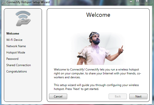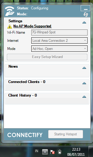 Nah, disinilah letak keunggulan winpad. Karena tablet PC buatan Cina ini mampu berjalan di lingkungan Windows 7 dan memiliki (built in) WIFI dongle dan modem 3G, maka winpad sangat cocok untuk diinstal connectify. Dengan demikian jika Anda memiliki gadget lain dengan built in WIFI, perangkat tersebut dapat juga melakukan koneksi internet asal terhubung dengan jaringan hotspot Winpad Anda. Keuntungannya, tiap gadget tidak perlu memiliki perangkat khusus untuk terkoneksi internet (misal modem), cukup satu saja di sisi winpad sebagai hotpot router. Keuntungan lainnya adalah Anda akan memiliki sebuah jaringan wireless mini, sehingga Anda dapat melakukan sharing file, chatting antar perangkat, atau sekedar belajar membuat web server lokal, dll. Yuuk, kita coba software-nya. Pertama kali download dulu software connectify di sini. Setelah itu ikuti langkah-langkah instalasinya sampai selesai dan muncul jendela pengaturan konfigurasi connectify sebagai berikut :
