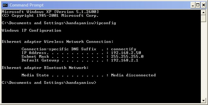Sekarang kita coba lihat IP address yang di-assig ke Winpad. Dari command prompt ketik ‘ipconfig’ dan IP address yang didapat adalah sebagai berikut: