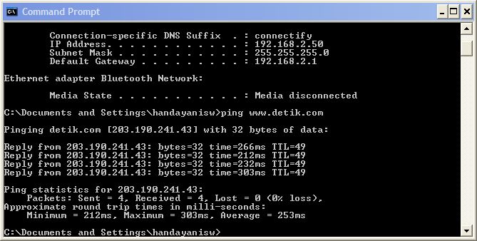 Perhatikan IP di atas. IP address laptop adalah 192.168.2.50 dengan IP gateway-nya adalah 192.168.2.1. IP ini adalah IP address Winpad! Sekarang sudah terbukti bahwa dengan connectify dapat membentuk jaringan hotspot sederhana. Untuk menguji koneksi internet, coba kita ping salah satu web portal yang cukup terkenal di Indonesia, dan ternyata ‘reply’ ! Berarti koneksi internet sudah bisa dilakukan.