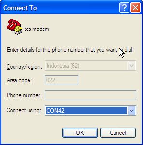 Berikutnya Anda akan diminta untuk memasukkan tipe koneksi. Pilih option ‘Connect using:’ dengan COM Port dimana modem Anda menciptakan virtual serial port. Sebagai contoh modem saya berada di COM42.
