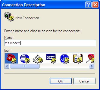 Setelah itu akan muncul window sebagai berikut. Tulis nama ‘New Connection’ dengan ‘tes modem’