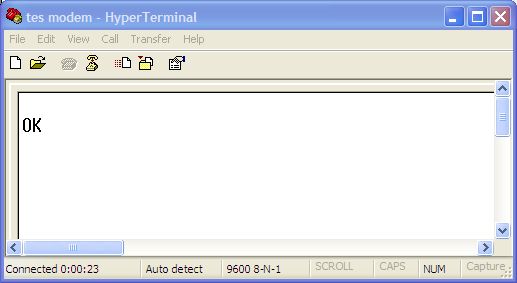 Setelah selesai setting parameter, maka window hyperteminal akan muncul. Ketikkan ‘at’ (tanpa tanda petik) dan tekan tombol enter