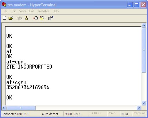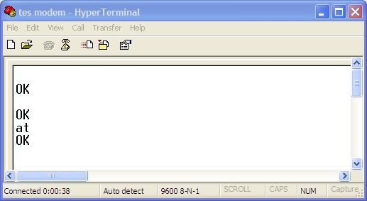 Jika hyperterminal sudah terhubung dengan modem, maka dalam window hyperterminal akan mendapat ‘jawaban’ dari modem dengan tulisan ‘OK’. Jika tulisan ‘at’ tidak muncul di window hyperterminal, tidak usah khawatir, karena mungkin secara default memang tidak diaktifkan fitur echo command-nya. Untuk mengaktifkan fitur echo (pengulangan/penulisan command) ketikkan ‘ate’ tekan enter. Setalah itu ketik ‘at’ lagi untuk meyakinkan proses pengaktifan echo telah berhasil. Seharusnya tulisan ‘at’ sekarang sudah muncul.