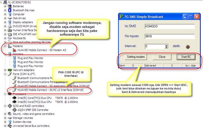 Selanjutnya klik tombol ‘Setting modem’ untuk memilih nomor COM port modem Anda. Oh ya, untuk mengirim SMS bomber ini, tentunya Anda harus punya modem (bisa modem 3G, modem GPRS, modem CDMA, modem handphone, etc) dan komputer (desktop atau laptop) dengan OS Windows (XP atau Seven). Untuk menentukan berapa nomor COM port Anda, bisa Anda lihat di Device Manager.