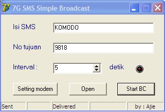Setelah itu tekan tombol ‘Open’ untuk membuka koneksi dengan modem. Jika koneksi berhasil makan Led indikator akan berwarna merah. Setelah itu coba ganti nomor 9818 dengan nomor Anda sendiri untuk memastikan bahwa software ini telah berjalan dengan baik. Setelah yakin sms sukses terkirim barulah ganti nomor tujuan dengan 9818, dan tekanlah tombol ‘Start BC’. Jika berjalan sukses maka di statusbar di bawah akan menunjukkan status sms terkirim (‘Sent’) dan berapa SMS yang diterima tujuan (‘Delivered’).