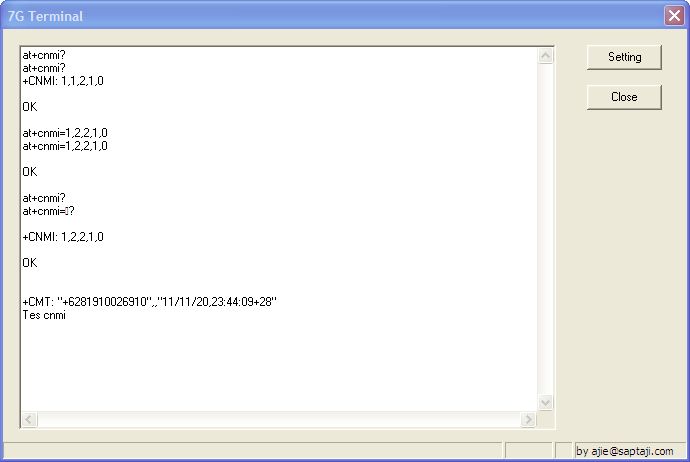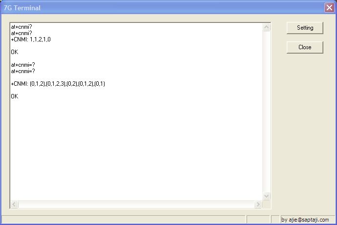Beberapa modem secara default diset untuk menampilkan indikator sms masuk ini, namun beberapa tipe yang lain tidak diset secara default. Untuk mengetahui status indikator SMS masuk ini dapat dilakukan dengan memberikan command ‘at+cnmi?’ . Gunakan program hyperterminal atau 7G Terminal untuk melakukan komunikasi dengan modem/handphone. Berikut syntax sekaligus arti dari parameter dalam command at+cnmi :