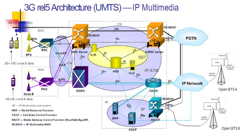 Skenario pertama adalah menginterkoneksikan output USRP+software OpenBTS (pada versi komersial ada tipe OpenBTS embedded on USRP) yang berupa interface ethernet ke IM-MGW (IP Multimedia Media Gateway). Jika OpenBTS terletak jauh dari MGW-nya maka data harus ditransmisikan menggunakan jaringan transmisi IP-based milik operator sendiri. Contoh skenario pertama ini dapat dilihat pada gambar OpenBTS B di atas.