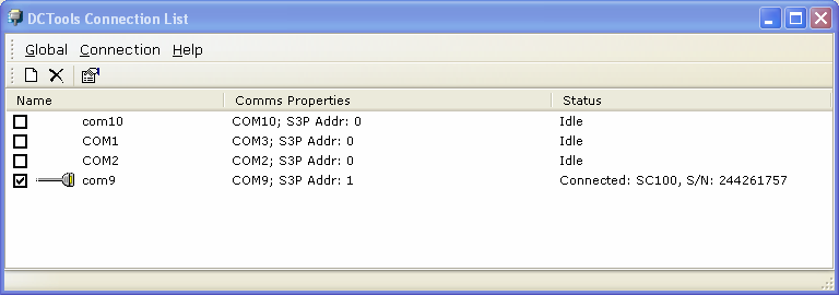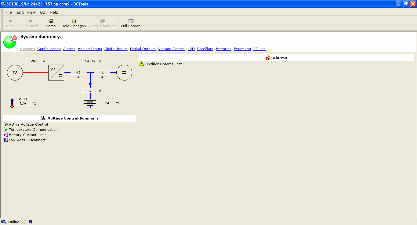 Pada contoh di atas, saya men-define IP 10.20.xx.xx port 5000 (remote) sebagai port serial COM9 (local). Setelah selesai menyetting VSP, langkah terakhir adalah me-running software DCTools untuk melakukan monitoring rectifier secara remote. Setting koneksi DCTools di COM9, centang koneksi tersebut dan tunggu beberapa saat, software monitoring akan muncul dalam sekejap 🙂