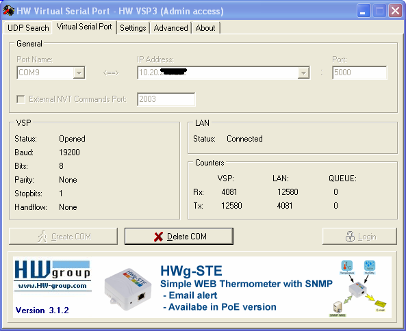 Karena Anda berada di kantor sedangkan port serial-nya ada di remote area, maka Anda harus create dulu virtual serial port (VSP) dari koneksi TCP/IP ari jaringan LAN kantor. Caranya mudah sekali, cukup menggunakan gunakan software gratisan di internet, yakni HW Virtual Serial Port (silahkan googling di internet). Instal software ini, dan kemudian definisikanlah settingannya sesuai dengan konfigurasi converter eth2serial yang anda pasang di rectifier remote.