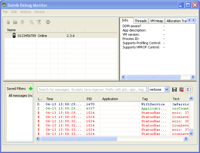Jika Anda mengunakan OS Windows XP, file ini ada di direktori C:\Program Files\Android\android-sdk\tools. Double click aja file ini untuk me-running-nya. Berikut ini adalah tampilan software ddms (Dalvik Debug Monitor Software) setelah Anda eksekusi.