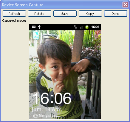 6. Setelah itu akan muncul jendela ‘Device Screen Capture’, dan seharusnya screen handset Android Anda sudah langsung ter-capture di sana. Anda bisa meng-copy, menyimpan gambar yang tercapture di jendela ini melalui tombol-tombol di sebelah atas. Jika capture screen belum muncul, coba klik tombol ‘Refresh’ atau periksa kembali konektivitas handset Anda.