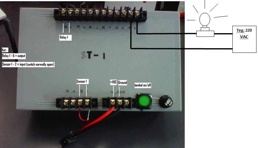 Contoh penggunaan terminal output adalah untuk menghidupkan beban (misal: lampu). Gambar ilustrasi wiring-nya adalah sebagai berikut: