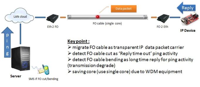 Sistem ini, sesuai judul artikel, adalah mengubah kabel fiber optik menjadi media transmisi paket data IP secara transparent (Anda harus mengalokasikan satu core fiber optik sebagai media indikator kabel putus/bending) menggunakan FO2Ethernet Media Converter. Setelah dikonversi menjadi ‘kabel data’ biasa, fiber optik dapat dilewatkan protokol TCP/IP, salah satunya adalah ‘Ping’. Dengan menambahkan IP device sebagai dummy disisi far end, dan melakukan ping ke device ini maka server dapat mendeteksi jika ada kabel putus/bending dengan jalan mengukur reply data hasil dari aktivitas ping. Untuk lebih jelasnya, Anda dapat melihat gambar di bawah.