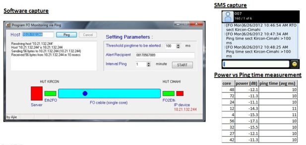 Dari desain sistem di atas, jika software di server mendeteksi ‘Reply time out’ atau ping time yang tinggi akan langsung melakukan dispatch alarm melalui SMS kepada field engineer atau nomor-nomor yang telah didaftarkan di software. ‘Reply time out’ merupakan indikasi kabel fiber optik putus, sedang latency/ping time yang tinggi merupakan deteksi kabel bending. Berikut ini tampilan software yang sudah saya buat, berikut capture SMS yang diterima field engineer