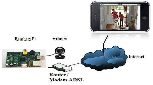 Baik, kita mulai dari perancangan sistemnya dulu. Di sini tujuan kita adalah membuat semacam CCTV online yang berguna untuk memonitor suatu tempat secara jarak jauh melalui internet. Salah satu implementasinya adalah memonitor rumah jarak jauh melalui smartphone Anda. Jadi jika ayahanda dan ibunda sedang sibuk kerja atau keluar kota, tidak perlu kuatir lagi dengan keadaan sang buah hati di rumah, karena bisa memonitor lewat smartphone masing-masing :-). Berikut ini adalah topologi jaringannya :