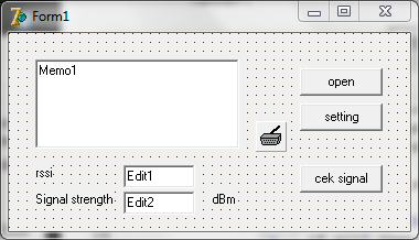 Berikut ini adalah source code Delphi untuk membuat program cek signal-strength. Sebelumnya siapkan modem (USB modem 3G) dan SDK Delphi tentunya. Buka program Delphi, buat project baru dengan nama terserah Anda. Ambil komponen TButton (3 bh), TMemo (1 bh), TLabel (3 bh), TEdit (2 bh) dan TComPort (1 bh) dari Component Pallete. TComPort merupakan komponen yang dapat melakukan komunikasi data melalui port serial (COM port) komputer/laptop. Anda dapat mengunduh komponen ini di sourceforge.net jika Anda belum memilikinya. Atur peletakan komponen-komponen di atas seperti pada gambar di bawah.