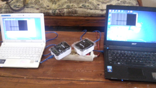 ADSL>>Modem PLC TP LInk (Rumah 1)–MCB (Rumah 1)–TRAFO/GARDU–MCB (Rumah 2) >> Modem PLC TP Link (Rumah 2) >> PC/Laptop
