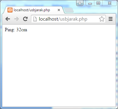 Anda dapat menyimpan file PHP di atas dengan nama ‘usbjarak.php’ (ada dalam CD dalam paket pembelian) dan simpan dalam folder ‘htdocs’ di XAMPP komputer Anda. Kemudian buka web browser kesukaan Anda (Chrome, Firefox, Safari, dll) dan ketik alamat ‘localhost/usbjarak.php’ di address bar browser Anda. Jika semua settingan benar (no port COM, baudrate=9600, dll) maka seharusnya akan muncul data pengukuran jarak sebagai berikut