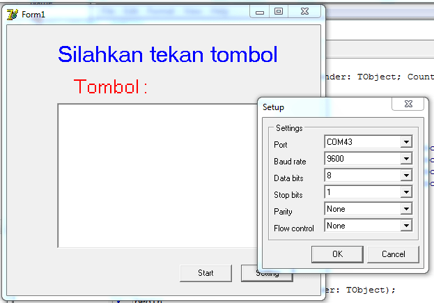 Jalankan program (F9), dan tekan tombol ‘Setting’ dan pilihlah COM port alat (cek di Device Manager). Setelah itu tekan tombol ‘Start’.