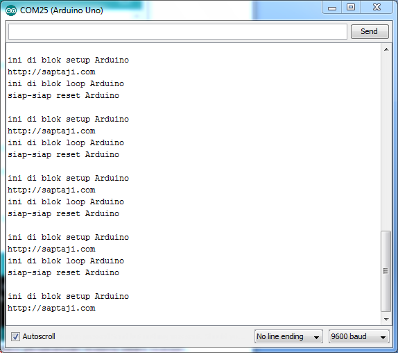 Perhatikan cara pendefinisian function ‘ku_reset’ agar berada di alamat 0 Arduino (baris [1]) dan cara pemanggilan function untuk reset tersebut (baris [18]). Untuk lebih jelasnya, silahkan buka jendela Serial Monitor melalui menu Tools-Serial Monitor. Perhatikan bahwa baris [19] di atas tidak akan pernah dieksekusi (tidak tertampil di jendela Serial Monitor) karena Arduino sudah di-reset terlebih dahulu (baris [18])