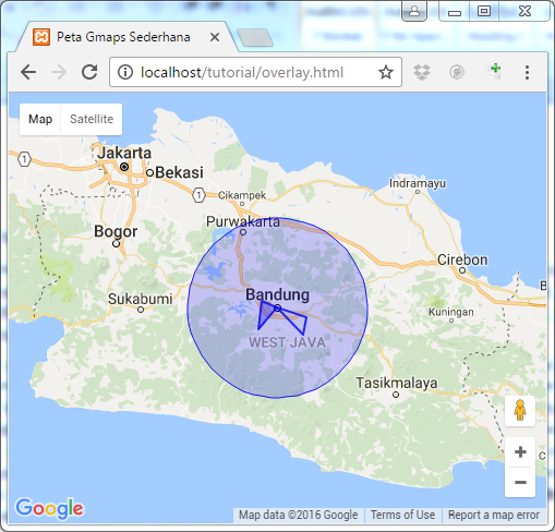 Salah satu fitur yang ditawarkan oleh Google Maps adalah menambahkan ‘overlay’ yakni semacam layer custom yang berada di atas peta Google Maps. Anda bisa meng-customize layer ini sesuai kebutuhan Anda tanpa mengganggu peta aslinya. Efeknya adalah peta online Anda akan semakin nampak interaktif dan lebih bermanfaat untuk pengunjung. Dan yang pasti, peta Googe Maps + overlay custom ini hanya akan tertampil di web Anda, tidak akan tertampil di web lain. Dengan overlay ini Anda bisa menambahkan marker, info window, lingkaran, polyline, polygon, dll. Dua item pertama sudah saya bahas pada tutorial sebelumnya, untuk cara menampikan lingkaran, polyline dan polygon di google map akan saya sampaikan tutorialnya pada artikel ini.