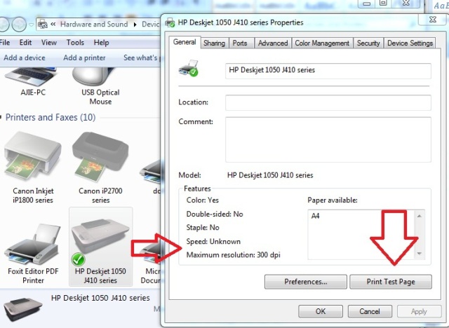 - Coba test print melalui menu (Windows 7): Start program – Devices and Printers. Cari printer Anda, klik kanan, pilih menu ‘Printer properties’. Nanti akan muncul jendela baru, cari tombol ‘Print Test Page’ dan klik. Pastikan printer sudah ‘ON’ dan kabel USB sudah terhubung dari printer ke laptop. Seharusnya printer akan melakukan default printing. Tapi jika gagal, berarti memang ada masalah di printer Anda.