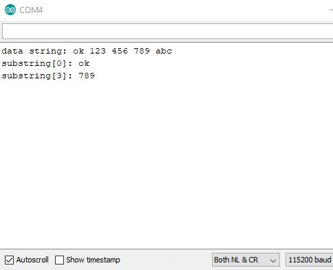 void setup() { // put your setup code here, to run once: Serial.begin(115200); String stringku = "ok 123 456 789 abc"; Serial.print("data string: ");Serial.println(stringku); String substringku0 = getValue(stringku, ' ', 0); Serial.print("substring[0]: ");Serial.println(substringku0); String substringku3 = getValue(stringku, ' ', 3); Serial.print("substring[3]: ");Serial.println(substringku3); } void loop() { // put your main code here, to run repeatedly: } String getValue(String data, char separator, int index) { int found = 0; int strIndex[] = {0, -1}; int maxIndex = data.length()-1; for(int i=0; i<=maxIndex && found<=index; i++){ if(data.charAt(i)==separator || i==maxIndex){ found++; strIndex[0] = strIndex[1]+1; strIndex[1] = (i == maxIndex) ? i+1 : i; } } return found>index ? data.substring(strIndex[0], strIndex[1]) : ""; }
