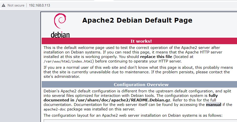 Selamat, sampai pada tahap ini Anda telah berhasil menginstal paket web server (LAMP) di Raspberry Pi Anda. Untuk mengujinya, silahkan buka web browser di laptop dan ketik IP Raspi Anda. Defaultnya akan muncul window sbb: