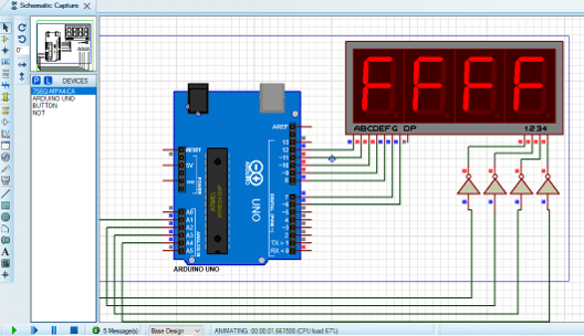 - Kemudian running projek proteus dan lihat hasilnya. Tombol run ada di pojok bawah kiri. Hasilnya akan menampilkan digit angka 3333.