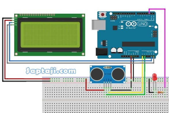 Baiklah, mari kita segera buat sistemnya. Alat dan bahan yang diperlukan untuk membuat sistem penanda batas jarak dengan sensor HCSR04 da Arduino Uno ini adalah sebagai berikut: