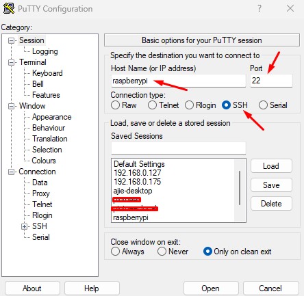 - Buka aplikasi Putty, lakukan kemudian remote login ke Raspberry Pi sesuai settingan pada gambar di atas